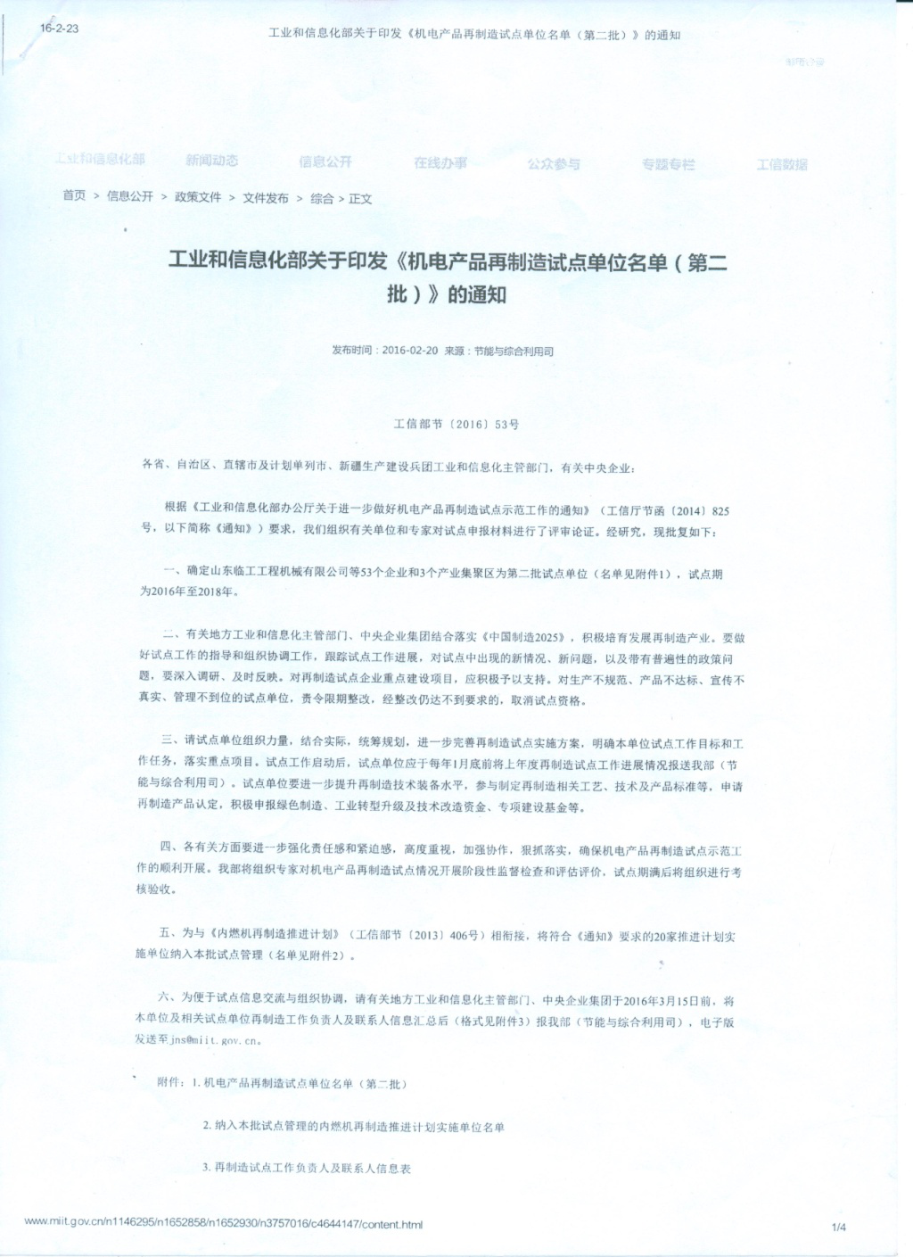 2016 國家工信部《機電產(chǎn)品再制造試點單位》